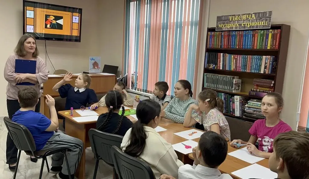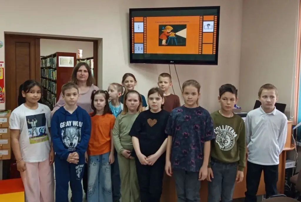 Библиотекарь рассказала, что в те далекие времена, когда не было интернета, различных гаджетов, и мультфильмы по телевизору показывали не часто, любимым развлечением ребят были диафильмы. Ребята посмотрели видео-историю развития диафильма.