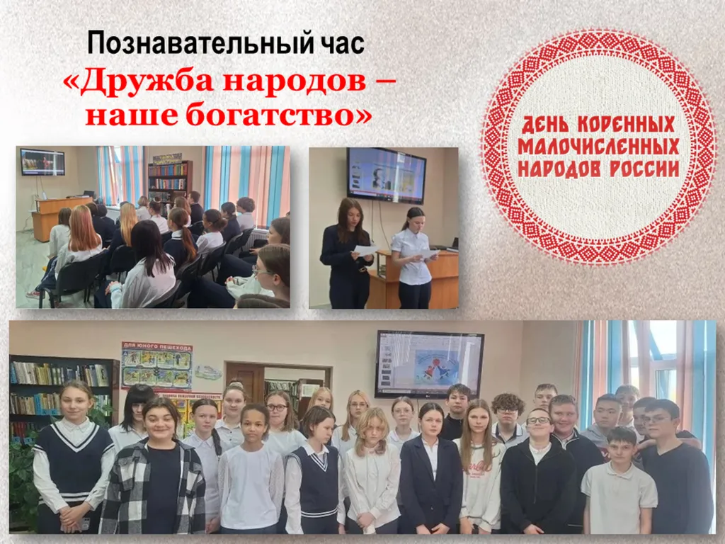 Выселковская сельская библиотека, филиал № 3 для учащихся 7В класса СОШ № 17 провела познавательный час «Дружба народов- наше богатство», посвященный Дню коренных малочисленных народов Российской Федерации, который отмечается ежегодно 30 апреля.