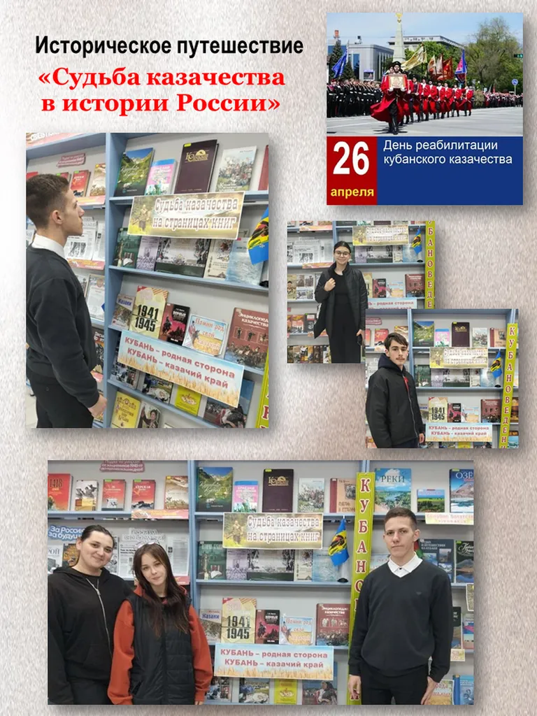 26 апреля – День реабилитации Кубанского казачества. К этой памятной дате специалисты Выселковской библиотеки для молодых читателей провели историческое путешествие «Судьба казачества в истории России». Ребята познакомились с историей, обычаями и традициями кубанских казаков, узнали о создании архитектурных и скульптурных памятников казачьей столицы, историю возрождения Кубанского казачьего хора. Особый интерес вызвала книжная выставка «Кубань родная-край казачий», где были представлены книги и статьи из периодических изданий о жизни, традициях, форме, оружии кубанских казаков, потому что все это на Кубани имеет особый колорит.